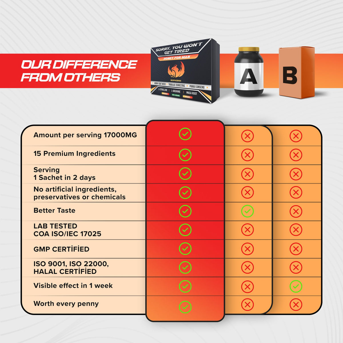 BIOPHOENIX TESTOSTERONE HONEY | Testosterone Booster | Testosterone Supplement for Men | Maca Root, Ginseng, Horny Goat Weed, Tribulus Terrestris for Men | L Citrulline, L Arginine 15 Sachets 30 Days - For Men